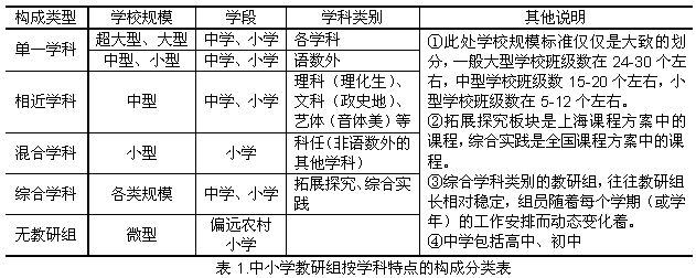 1.问题的由来 在讨论教师专业发展与学习共同体、学校教学工作要求、学校课程执行力等问题的时候,往往会涉及到一个名词“教研组”。大家都知道教研组是一类国内中小学校中基本的业务组织单元,但深究下去“教研组究竟是如何构成的?”、“教研组究竟做什么、怎么做?”、“教研组大致的工作流程是怎样的?”、“教研组是学校最基层的行政组织单元吗?”等等问题,我们往往语焉不详。国内这方面的文章大部分是各学校教研组工作的经验性总结,较为理性的研究为数不多,但这些少数的研究却较为深刻。陈桂生先生从我国教育发展的历史视角梳理出了教研组的演变轨迹①,帮助我们从事物的发生发展来认识“教研组”,指出教研组原有职能为学校中“单纯的教学法研究组织”,顾泠沅先生则从教师专业发展与学校实践的角度指出教研组是“学习型的实践共同体”,认为“提新课程改革背景下的教学实践智慧,教研组仍然是一个非常重要的阵地”②。 本文试图在实践与学习的基础上,尝试结构化地表达我们对教研组构成特点、常见职能与一般工作流程的认识,在表达的过程中梳理我们自己的思路,以期为有效实践做好较为详尽的行动准备。 2.教研组的构成与职能 最初教研组就是作为学校内“非行政类教学研讨组织”而被设计出来的。我们在思考教研组分类 2.2教研组的职能