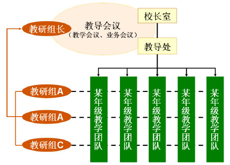 图2.教研组的主要工作任务 教研组教研活动就是研究学生、研究学习目标和内容(课标教材)、研究教法,会聚到教学执行与教学实效。从实践来看,学校各教研组的建设与学校的办学水平、教学质量之间存在着密切的关联关系。学校课程执行力的建设提升与教研组建设直接相关。 2.3 教研组的运行特点与其他业务部门的相互关系 图3.学校内部业务组织结构中的教研组
